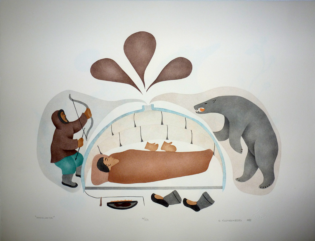 A man was out hunting for food for his family but he was having a hard time finding any animals. That night he had a dream. He was told by a man to use the bow and arrow to kill the bear. The next morning he saw the bear a few miles from his igloo and was successful.