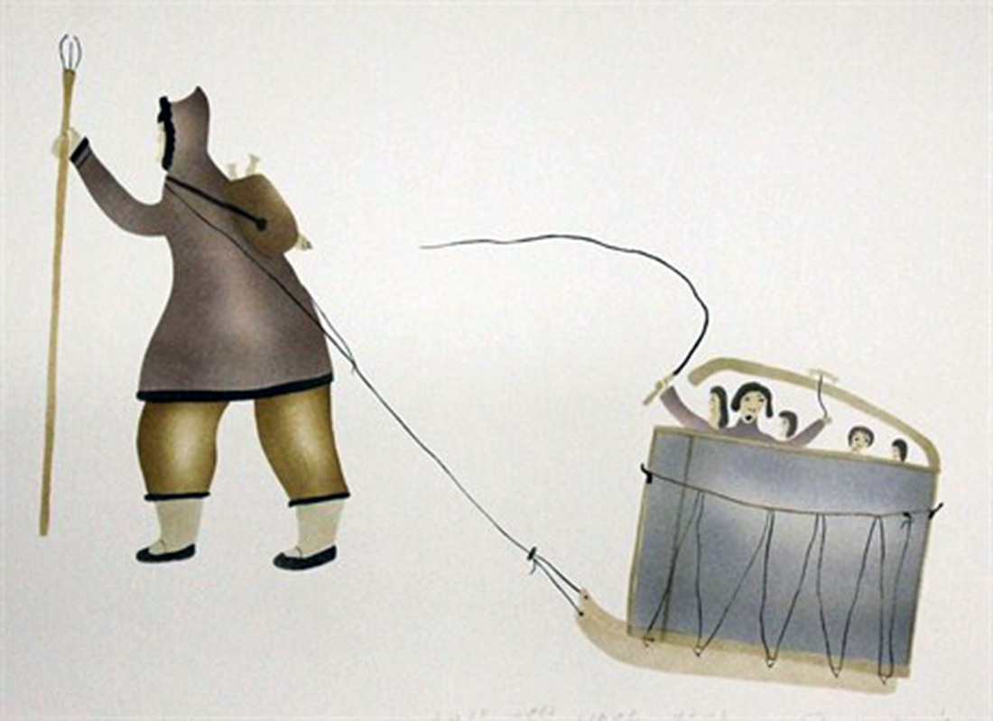 “The children are happy because they are being pulled on a sled, and because they are going someplace.They are going out fishing. This print shows that even if we were not going to have a bumpy ride we used to be very happy children”.