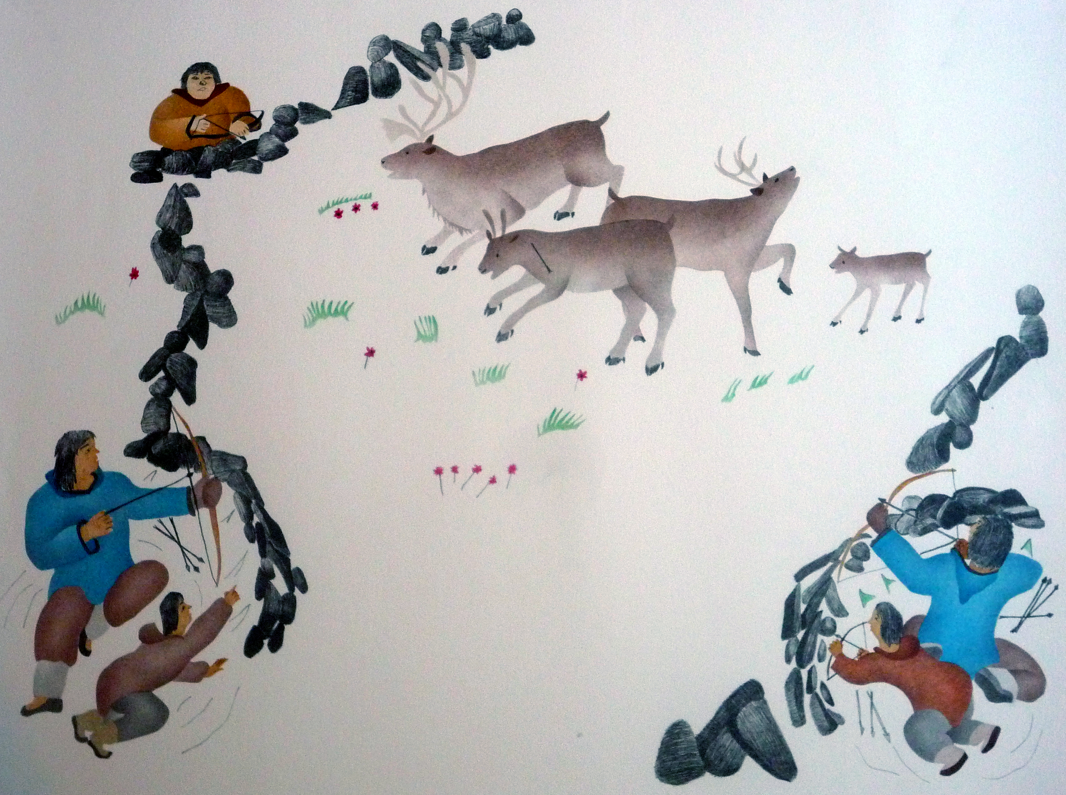 In Prince Albert Sound, at a place called Halahegivik, there are flat stones and rocks placed up to form a fence. The stone or rocks resemble people. When Caribou are near, men and boys wait in pits hidden until the caribou are close enough to hit with wooden arrows tipped with copper points. The fences start miles back and women carefully steer the caribou towards the men.