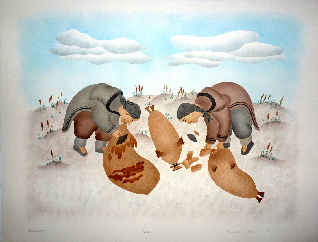 In late spring when people would start getting a lot of seals, they would make a bag out of sealskin and save all the seal blubber in it. They would cut the meat into pieces to dry it and stretch the skin to dry. In the fall, the blubber that was saved in the sealskin bag was used for fuel on the stone lamp.