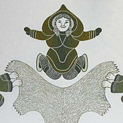 Paul’s sculpture looks as though it was formed from black licorice, and a sweet piece it is. Our shaman is sailing aloft on the winds, the horizontal lines in his hair and wings evoking the sound of the air rushing over and around him. He is a shaman carved in modern times yet his roots are anchored in legends from the past from where the ancestors can be called to protect and comfort their descendants. An ageless Inuit image in our present day and age.