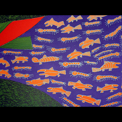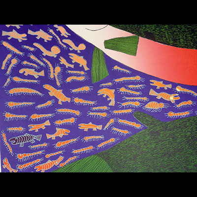 Sadly, Meelia Kelly passed away in April, 2006 and is represented in the annual collection for the last time.Meelia was the younger sister of the late Sheojuk Etidlooie. Like her sister, Meelia was a latecomer to the graphic arts, and her work reveals a similar mature confidence and talent. Encouraged by her sister to draw, Meelia began bringing her drawings to the studios five years ago and has since worked in both etching and lithography during workshops held in Cape Dorset. Her work has been represented in the annual collections since 2001.This year, Meelia is represented by four images, all displaying her sense of humour and originality. Bold, exaggerated shapes and colour occupy Meelia’s graphic sensibility, particularly evident in this year’s ‘Early Bird’ and the charming, ‘Hoot’. Like her late sister, Sheojuk, Meelia’s images have great graphic appeal. She will be missed.