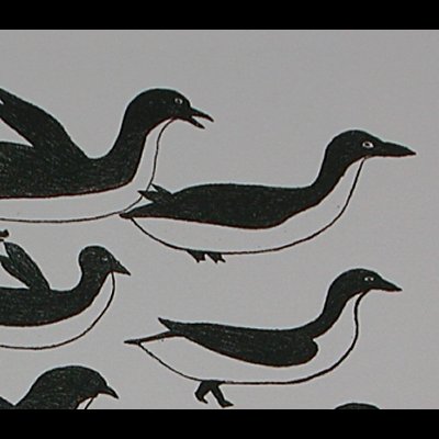Ohotaq was born in 1936 and lives in Cape Dorset with his wife Qaunak, who is a carver and traditional throat-singer.Ohotaq began drawing in the early years of the print program in Cape Dorset, and his print, Eskimo Fox Trapper, was released in 1961. He became less involved with drawing as the community grew, working full time instead for various community agencies. Since his retirement from his job as caretaker of the Peter Pitseolak School in Cape Dorset, Ohotaq has again expressed an interest in drawing. We were pleased to include three of his prints in the 40th anniversary collection released in 1999. Since then he has become a fixture at the table in the Kinngait Studios, working on drawings covering a wide range of themes and subjects, including an illustrated life history.This year’s collection includes three images by Ohotaq, all illustrating his unique drawing style and, especially in Face to Face (2009-29), his quirky sense of humour.