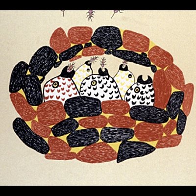 Among the first in Cape Dorset to begin drawing Pitseolak Ashoona remained, until her death, one of the most prolific of the communities artists. Prints of her drawings appeared in every Cape Dorset collection from 1960 until her death in 1983! Her works have received widespread public acclaim. Pitseolak’s works hang in the National Gallery of Canada and other important public collections. Hundreds of her drawings have been printed making her the most extensively published of the Cape Dorset graphic artists. In 1977 she became the second Cape Dorset artist to be awarded the Order of Canada for her artistic achievements. [Kenojuak was the first in 1967]. Seemingly unaffected by the widespread repute that her graphic work achieved, Pitseolak spoke simply and unassumingly about her live and her drawings. She was born in 1904 on Nottingham Island in the Hudson’s Strait when her parents were travelling between Northern Quebec and Baffin Island. Pitseolak grew up in various camps on the south Baffin coast and was married as a young woman to Ashoona. She and Ashoona had a large family: twelve natural children, including four who were adopted out and one who died in infancy. Pitseolak had vivid memories of her life with Ashoona, a strong hunter, and of wandering between distant hunting camps. Ashoona himself died during an epidemic in the Nettling Lake area when still in his prime leaving Pitseolak to raise their large and young family. She continued to move with her children to different camps settling permanently in Cape Dorset in the early 1960’s. Explaining her decision to begin drawing Pitseolak is recorded as having said: ” I started drawing after others were drawing. I was here in Cape Dorset… nobody ever asked me to draw. Because my son’s [Qaqaq’s] wife died when his two children were very young, his children used to stay with me. One night I was thinking, ‘maybe if I draw they will get something’. So one night I started to draw, and I drew about three. The papers were small then. The next day I took them to the Co-Op and gave them to Saumik [James Houston] and he gave me $20 for those three drawings. When I got out of the house that he was in I looked at the $20 and I said to myself, ‘ Saumik – I think you made a mistake. He didn’t really look at the money’. To me, $20 was so much and I thought he had made a mistake. Because for my first drawings – I got that money – I realized that I could get money for drawing. Ever since that time I have kept drawing”. Musing that she has to think quite hard when she is drawing Pitseolak observed, “When I draw things that I have seen in the past, I think about them, and, in my head, they look good. But when I put them on paper, they look different from in my head. I am usually happy about them when I finish them because when I put the colours on them they look quite good”. Pitseolak actively supported the growth of the Co-Op since she began drawing back in the early 60’s.