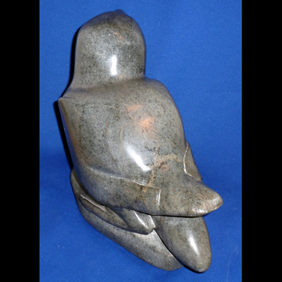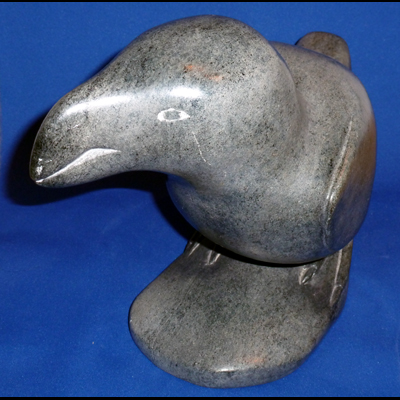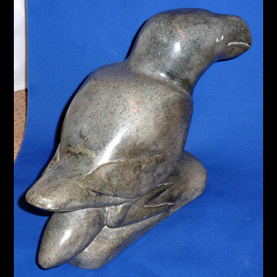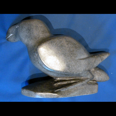 Suqualuk’s favourite subjects are whales and birds and here sits a fine example of a puffin laying its single egg on a rocky crag. This lone female would be sitting among thousands of other noisy puffin couples, raising their “only child” pufflets on a treeless, barren island in the northern ocean.