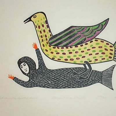 Quote from the 1966 Cape Dorset Print Cataloque: * Perhaps the most widely popular of the Cape Dorset artist’s, Lucy’s subject matter has always been interesting, her view point fresh and warm and her style distinctive. Her print, “Woman’s Bear” foind its way into the Tate Gallery, she is among the most prolific artists at Cape Dorset.*