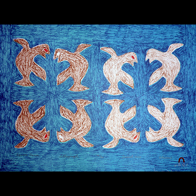Sarni was born in 1922. She was the sister of the well-known Cape Dorset sculptor Pauta Saila. Her husband was the late Pudlat Pootoogook, son of the well-known camp leader and early graphic artist Pootoogook.Like many Inuit of her generation, Sarni was attracted to the graphic arts during the early years of the printmaking program in Cape Dorset. Her work was represented in the 1964/65 and 1966 annual print collections; she has only recently returned after a long hiatus, no doubt preoccupied in the ensuing years by the distractions and demands of her growing family. Her work was included in the 2000 Spring Collection and the following year, Imaup Qimminga (2001-30) and Isiit (2001-31) were selected for the annual collection. In the 2003 annual colection, Sarni was represented by one print ? Dancing Spirits (2003-28). This image is typical of her unique and enduring style; whimsical and yet graphically bold, with a strong sense of design and motif.Sadly, this image was Sarni’s last, she passed away early in 2003.