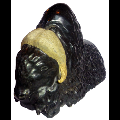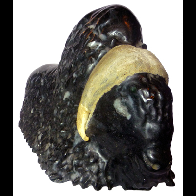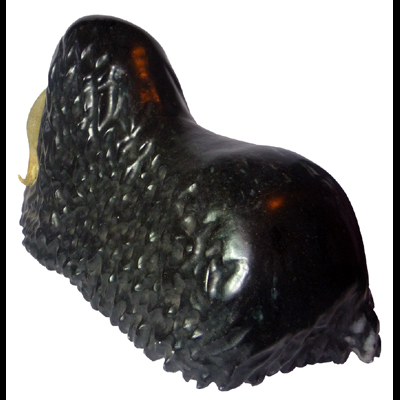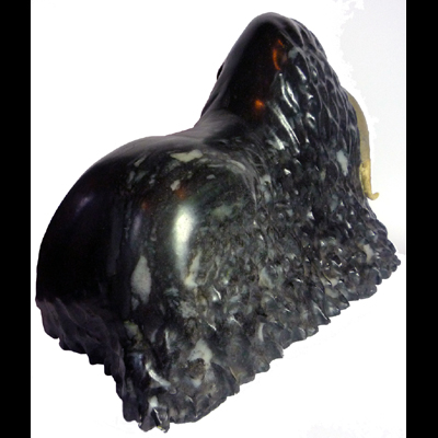 This piece is dominant in it’s mass; The obvious presence accented by riveting textures with such detail has not been observed in any previously seen carvings. The Majesty of this Mammoth Muskox is apparent in it’s steadfast gaze toward the horizon as one observes it’s pointed stance parallel to the land it stands upon. Recommended for a highlighted centerpiece among an already impressive collection or as an impressive stand alone centerpiece.