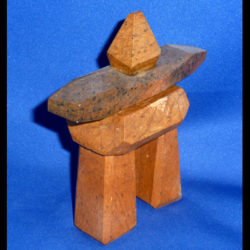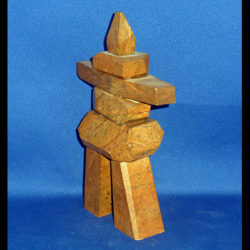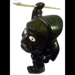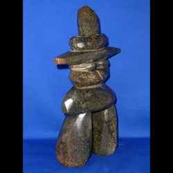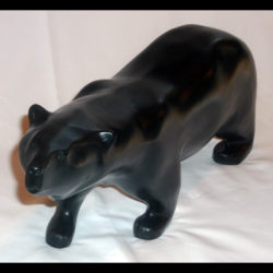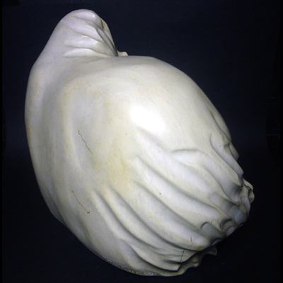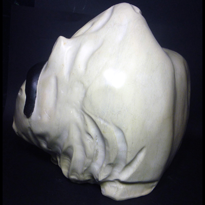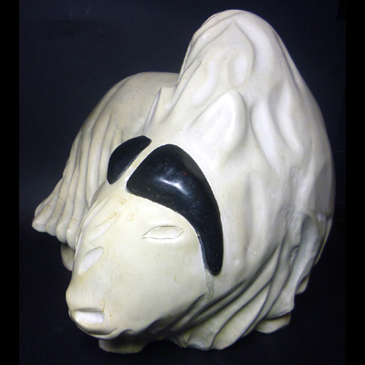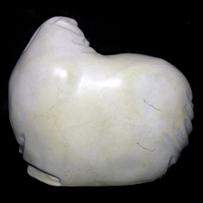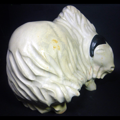 Mark comes to mind as a bear carving master and here he has put his talent towards working an icy white piece of alabaster into an iconic Arctic creature, the musk ox. Usually portrayed standing defensively against the prevailing gales, this bull seems curious, turning to test the scents on the winds ruffling its shaggy, protective overcoat. His black horns set off and accent his smooth, white body.