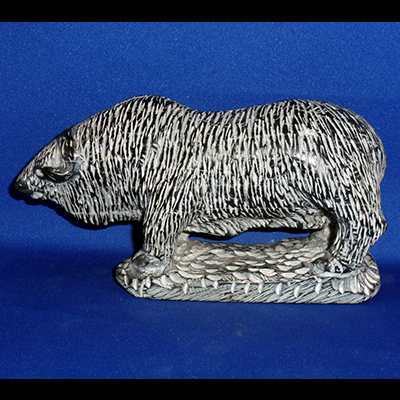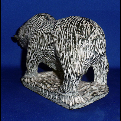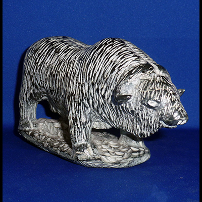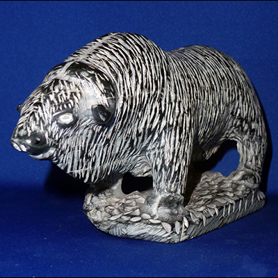 For 8 months of the year, the muskoxen’s (Ovibos moschatus) range is covered with snow. In the high arctic islands, 4 months of the year is spent in darkness with temperatures of -30 and -40? C combined with winds from frequent blizzards. Without their remarkable two-layered coat, muskoxen would never survive such extreme conditions. To the Inuit, they are known as “Oomingmak” or the bearded one. This piece is obviously stunning with its contrast of white on black. Luke Airut is an inspiring Inuit sculptor whose works are now hard to come by. Such a piece as this in its solid pristine quality is rare.