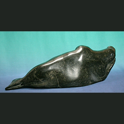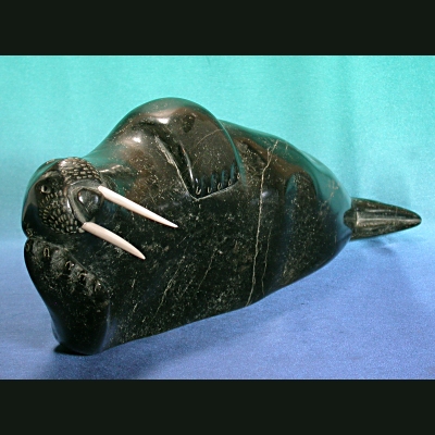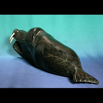 Here basks a beauty of a fully mature bull walrus. His wonderful, voluptuous body is sleepily laid out upon the ice for the sun’s rays to caress. Nuyaliaq has taken great care to incise the claws on the slumbering animals flippers, and the ivory tusks highlight the creamy veining and marbelling in his summer fattened body.