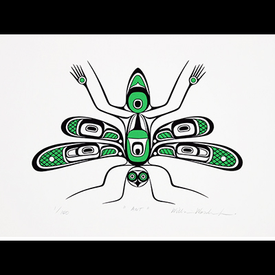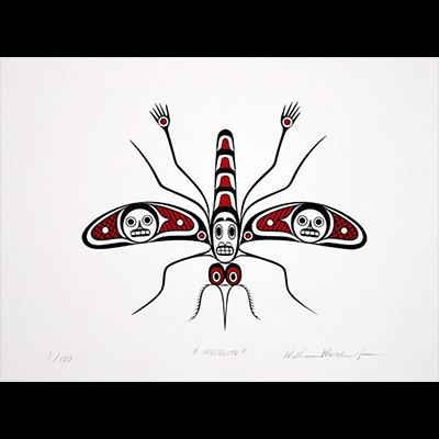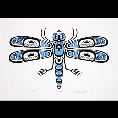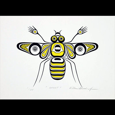 Set of four prints same size same colour paper.K̓adalat̓si “Ant” is a special insect that is connected to ghosts and their realm in the underground. These small creatures are able to tunnel into the earth and are messengers for the Chief of the Ghosts. Ants are seen as the keepers of ancient knowledge and teach us about loyalty and working together in unity. The color green is a color that symbolizes growth and wealth that comes from under the sea.Mama’k̓wa “Dragonfly” is associated with warriors and is the guardian spirit for certain warriors. During warrior dances, warrior’s bodies are pierced and hung up in the roof beams to appease the Warrior Spirit Winalaga̱lis. When the dancers blood is shed, spiritual balance is restored for the people. Depending on the color of the guardian spirit, a warrior dancer could have small blue and black paddle-like ornaments that are sewn to their regalia symbolizing the wings of their powerful insect guardian spirit.Ha̱msa̱lał “Hornet” are respected as spirit protectors for warriors. If a warrior’s spirit is this bright insect, the paddles on their regalia will be a bright yellow mixed with black. The name Ha̱msa̱lał refers to the humming sound that these insects make. This sound is associated with the presence of spiritual power from Winalaga̱lis. The Kwakwa̱ka̱’wakw have an instrument that is a small wooden paddle in the shape of the hornet’s wing attached to a long rope that is spun over the head to imitate this powerful humming sound, indicating the spirit of warriors is near.Dłisdła̱n “Mosquito” is associated with the Man-Eater Baxwbakwalanuksiwe’. In the ancient legend of the A̱wik̓inux̱w “Rivers Inlet Tribe”, their ancestor Na̱nwaḵawe’ “Wise One” after killing the dreaded Man-Eater, took his ashes and his family and blew it into the four directions saying, “Now you will be the biting insects of the world, you will crave human blood and remind us of the power of Baxwbakwalanuksiwe’.” The color red in the design represents the mosquito’s craving for human blood, and also represents the color of “life” among the Kwakwa̱ka̱’wakw.- William Wasden Jr.William Wasden Jr., or Wak̕analagalis ʼThe-River-Flows-Through-Him-Foreverʼ was born at ʼYa̱lis (Alert Bay) British Columbia on October 14, 1967.Chief T̕sesti’lela Wa’kas Simon Dick initially taught William basic art forms at a very young age. When he was 12, he was enrolled into Chief and Master Carver Douglas Cranmer’s art classes at Alert Bay. Later, William came under the tutelage of his cousin Beau Dick at Alert Bay. In the years that followed, William attended Haida artist Don Yeoman’s native art classes in Victoria from which he received the Henry Hunt Memorial award for artistic achievement. In the late 1990’s, William began jewellery engraving with Paddy Seaweed and Randy Cook and he has since returned to that art form.During his high school years, William heard his grandfather, Singer/Composer/Chief Thomas Hunt, sing for the first time and he was moved so much by this experience that he decided to shift his focus from artwork to traditional singing with hopes of preserving the dying tradition.To this day, William continues to learn from recordings and present day knowledge that remains. He is grateful to have been taught to sing by his Elders at a time when the tradition had almost faded away. William continues to teach singing in Alert Bay and also leads the ‘Gwa’wina Dancers Cultural Society’, a professional dance troupe, whose intention is to share authentic Kwakwaka’wakw culture and teachings.