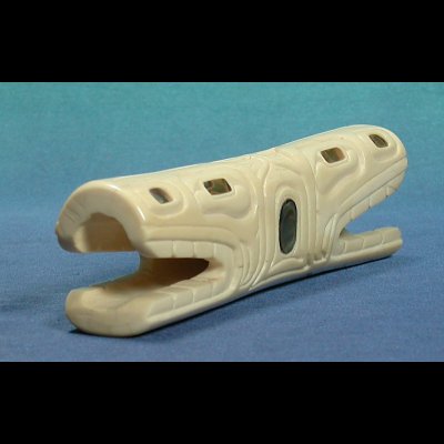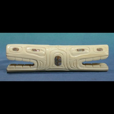 This is a beautiful example of Northwest Native imagery and carving expertise. The clean, concisely executed lines, silvery abalone inlay and the animal motif are typical of West Coast art. I believe that this animal is “bear”, what comes to your mind?