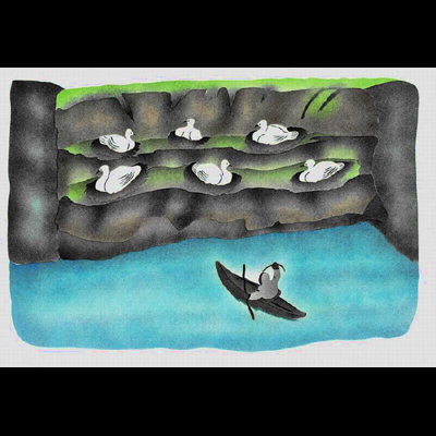 Seagulls are nesting, caring for their eggs. A man on the kayak is going to gather some eggs. This hunter used only a bow and arrow. The seagulls are on a cliff.