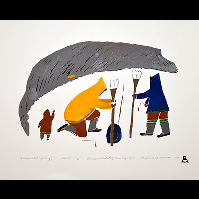 Elisapee Ishulutaq is a celebrated printmaker and graphic artist from Kagiqtuqjuaq, NU who resides in Panniqtuuq (Pangnirtung), NU. After moving to Panniqtuuq, Ishulutaq began her artistic practice and quickly started selling her work. Since then she has continuously made work and was included in the first Pangnirtung Print Collection in 1973 as well as each subsequent year a print collection has been released. While Ishulutaq mostly works in print and drawings she also carves and has transformed many of her prints into tapestries.Ishulutaq’s work is driven by a narrative thread and often present an older way of life before settlements mixed with contemporary issues affecting Inuit. In her piece Climate Change (2012) Ishulutaq depicts a lone Inuk in a parka, an igloo and a tree on either side. The figure faces the tree, which has begun to bloom despite being rooted in a patch of icy ground [1]. Behind them is a melting igloo, which seems to slump towards the figure, the impact of the heat warping its shape into an uncomfortable bend. Ishulutaq’s piece shows the effect that climate change has on Inuit communities and their ability to practice traditional ways of living.In 2016 Ishulutaq made four large-scale oil stick drawings that focused on the issue of youth suicide in northern communities. The works were the central focus of the larger solo exhibition Remembering A Future, Too at Marion Scott Gallery, Vancouver, BC. Over the four panels Ishulutaq remembers an event from 1996 in which a young boy took his own life a year after his older brother had. In the light of recent youth suicides Ishulutaq decided to break the silence and portray the tragedy in an effort to highlight the confluence of political issues that she feels contribute to the increase in suicide [2]. In particular the loss of connection to the land and cultural values as well as the lack of support provided to northern communities [3].Ishulutaq has exhibited her work around the world in institutions such as the Winnipeg Art Gallery, the Inuit Galerie, Mannheim, Germany and Galleria Nazionale d’Arte Moderna, Rome, Italy. In 2014 she was awarded the Order of Canada for her contributions to the cultural and economic health of her community. Ishulutaq and her work have appeared in multiple publications including many profiles in the Inuit Art Quarterly. She was featured on the cover of IAQ’s Spring/Summer 2010 issue.