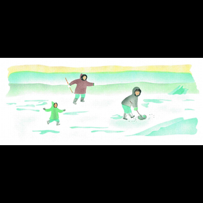 The title, and the meaning of my drawing is this; Back when we were children, we were born into a world of hunting, because this is how our parents survived. Even children without supervision can hunt younger seals. Our hunting helps us to live and be healthy. These young people are happy in their lives.
