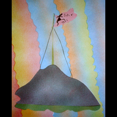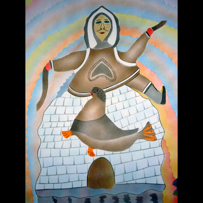 Artist Statement “I made this with an Inuk, a seal, land and an igloo, just out of my imagination. One of the man’s legs is supposed to be behind the igloo, so we don’t see it. The sky can appear to us in any colour. My pencils give a fair idea of the sky, but I wonder what real paints would do. Recently, when I was south to open a show of my drawings in Toronto, I was asked whether I used some specialized printing techniques. I said we had nothing out of the ordinary. My favorite colours are black and pure colours that hold their own when I overlay them.