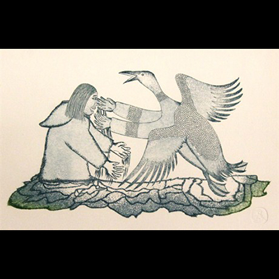 I have been living in Pangnirtung since 1967. I originally came from Iglootalik in Cumberland Sound where we lived in a permanent hunting camp. When I first started working at the print shop I wasn’t very good at it. Now, since I’ve been printing for a while, I’m getting better at it. I’m very slow still. When we do stone cuts, after we have applied ink on the stone and put the printing paper down, we use a spoon to spread the ink.Last year I was living off the land just outside of Pangnirtung for a year. Now I am in charge of the printers here in our shop”. [1975]
