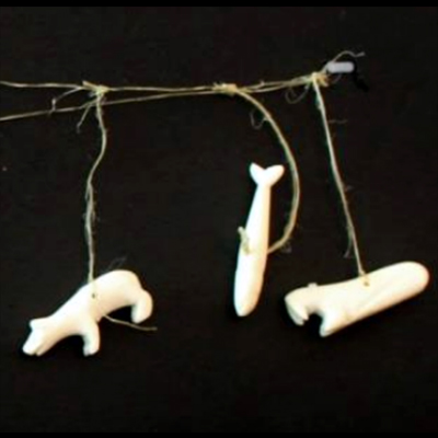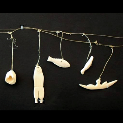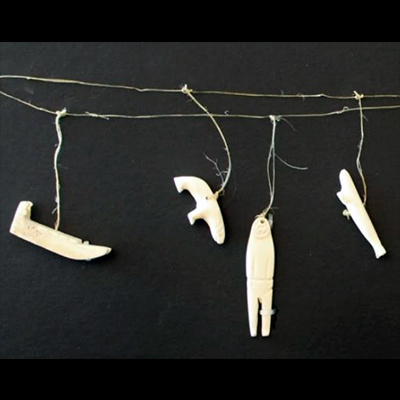 A synopsis of the Inuit world done in small ivory carvings suspended from a circular band of gut. Twelve different carvings depict: (left to right)Dogsled, bear, man, seal, igloo, woman, fish, bird, kayak, dog, whale and walrus.Approximate diameter is one foot with carvings 1″ to 1.5.”We have come across exciting new pieces from a collector who put together his fabulous Inuit collection in the 1960’s and 1970’s. Having immigrated from Germany to British Columbia in 1952, he rapidly gained an appreciation and passion for the rich cultural heritage of Canada. In British Columbia he made personal connections with many inspiring Northwest Coast Native artists such as Ellen Neel and Rufus Moody and developed a strong interest in the retelling of their mythology through art and carving. But he was also intrigued by the Inuit art ? the keenness of their observation of their lifestyles and the hunt which the Inuit carvers simply and beautifully retold through their tools and soapstone. He acquired his pieces from La Federation des Cooperatives du Nouveau-Quebec as well as La Societe Cooperative de Povungnitik. He had the opportunity to personally visit the Federation des Cooperatives du Nouveau-Quebec in the early 1970’s where he acquired many of his favourite pieces. He kept many of the pieces for himself but also resold many carvings as a means of financing his collection. As this was a time long before the internet, photocopiers and digital cameras he spent countless hours sketching each piece with carbon copies to send to interested buyers, predominantly in Germany. He passed away in 1990 and the family, in the interest of downsizing , has finally decided it is time to find a new home for this treasured collection.