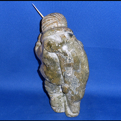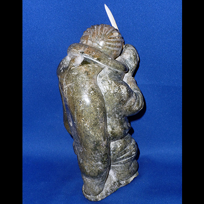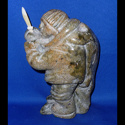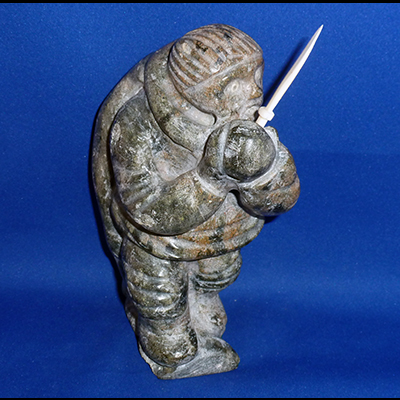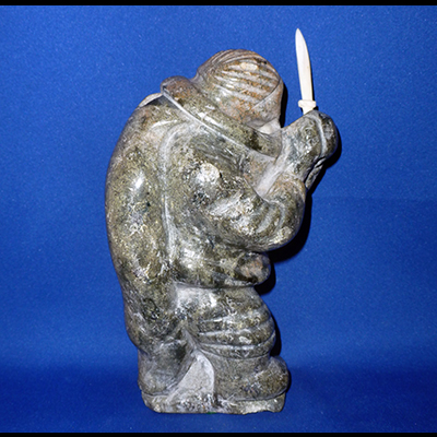 This is a vintage carving, and looks it, showing less artistry and more emotion than modern pieces. The man looks overwhelmed by his task and is obviously wary, brandishing his -?-(knife) to warn off potential threats, perhaps marauding polar bears in the vicinity.
