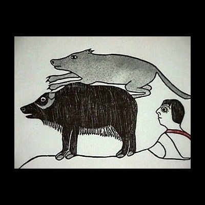 Janet’s husband, the late Mark Uqayuittuq (1984), was also an artist. “Janet Kigusiuq is best known for her graphics but has also gained significant recognition in the medium of fabric art. She was born in the Back River area of the Keewatin region of the Northwest Territories and is the eldest daughter of Jessie Oonark. Oonark was one of Baker Lake’s–and Canada’s–most distinguished artists. Kigusiuq was encouraged by her mother to draw as a means of making money to supplement her family’s meager income. With uncanny clarity and a steady hand, Kigusiuq draws intimate portrayals of neighbors, friends, and relatives engaged in the daily activities of camp life rendered in minute detail, often from multiple viewpoints. She also enjoys portraying the myths and legends told to her as a young child by her grandmother. Over the years her style has evolved from a strong linear style with color as a decorative accent to a more painterly style where vibrant colors are applied in thick overlays of colored pencil. Kigusiuq’s graphic art incorporates, in a limited manner, Western conventions of spatial perspective–shapes sometimes overlap, and there are subtle implications of volume and space.”