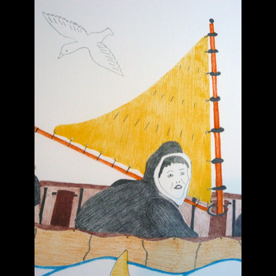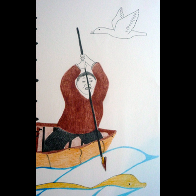 Three men went out whaling in a small sail boat when they saw whales in the distance. They did not move or make noise in the boat and sailed right up to the whales.