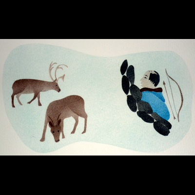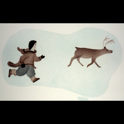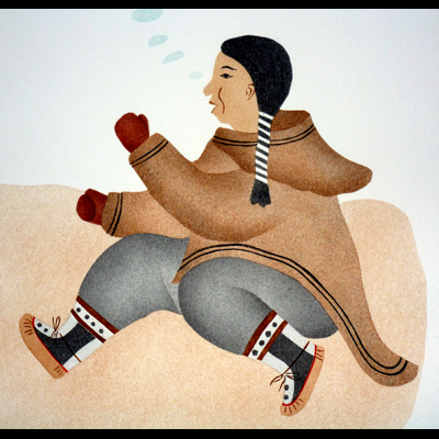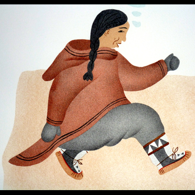 Two ladies were heel kicking. When they were getting tired, they started thinking of the time when they were chasing caribou towards the people that were hiding behind the rocks.