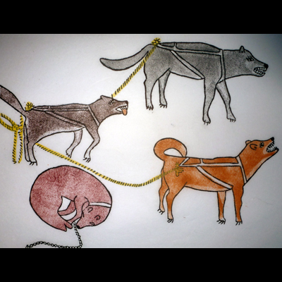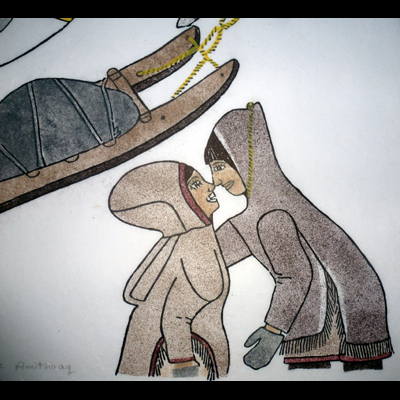 Born: April, 1940 Female E2-390 Place of Birth: Back River Resides: Baker Lake Drawings, Prints, Crafts, Sculpture, Wallhangings “Nancy Pukingrnak was born in the Chantrey Inlet area of the Keewatin region of the Nortwest Territories. As a young child she led a traditional nomadic existence at the inlet and along the banks of the Back River, living in igloos in the winter and tents in the summer and susisting on a diet of caribou and fish. She was brought to the nearby settlement of Baker Lake in the spring of 1958 following a difficult winter marked by a severe shortage of land foods in the Back River area. In a dramatic rescue by the Canadian armed forces, a starving Pukingrnak and her mother, Jessie Oonark, were airlifted to safety. Pukingrnak settled permanently in Baker Lake and married shortly therafter. She has given birth to eleven children, seven of whom are still living. With encouragement from her mother, who went on to become one of Canada’s most successful artists, and her sister, Victoria Mamnguqsualuk–both enthusiastically involved in the arts and crafts program initiated at Baker Lake by the Federal government in the early 1960s–Pukingrnak started carving in 1962 and did her first drawings in 1969. Pukingrnak’s other siblings, Josiah Nuilaalik, Janet Kigusiuq, Mary Yuusipik, Miriam Nanurluk, and William Noah, also became established, successful artists in their own right. Pukingrnak has forged an equally successful name for herself in the field of Inuit art. She is best known for her drawings and sculpture but also works in fabric. Her grandmother’s stories of bygone days and Inuit mythology as well as her own childhood memories serve as an endless source of inspiration. Three recurrent themes dominate Pukingrnak’s work–intimate domestic scenes of life on the land, lively depictions of ‘Qiviuq’, the legendary Inuit hero, and graphic portrayals of ‘Qavaq’, the mythological multi-headed creature with clawed hands and feet and a tail who preys on human beings. In her art making, Pukngrnak combines old skills with new ones. She is intimately familiar with the traditional life of the Inuit and is herself a meticulous sewer of caribou skin clothing. Yet exposure to books, magazines, and television over the past thirty years has had a profound influence on her view of the world. Pukingrnak’s incorporation of Western conventions of spatial perspective distinguishes her art from that of older Inuit artists who draw without reference to space.”