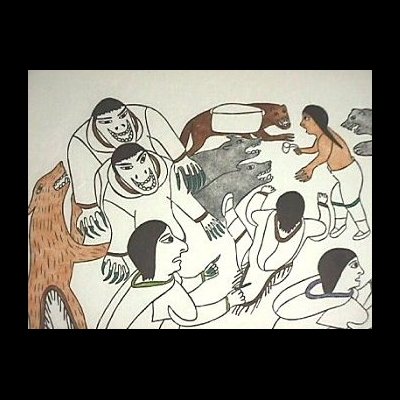 Born: 1930 Female E2-386 Place of Birth: Black River Area Resides: Baker Lake Drawings, Prints, Wallhangings, Sculpture Victoria’s husband, Samson Kayuryuk, creates carvings, prints and drawings. Their son, Paul Aglakuaq Kayuryuk, is also an artist. Victoria is the daughter of Jessie Oonark and most of her brothers and sisters are artists: Janet Kigusiuq, Nancy Pukingrak, Peggy Qablunaaq Aittauq, Mary Singaqti Yuusipik, Josiah Nuilaalik, Miriam Marealik Qiyuk and William Noah. “Victoria Mamnguksualuk is one of the best-known Canadian Inuit artists of her generation. Born near Garry Lake, Northwest Territories, she lived a migratory existence on the land until she was in her early thirties. Because of widespread disease and famine in the hunting camps of the Barren Lands region, Mamnguksualuk and her family, like many Inuits, moved to Baker Lake in 1963. Mamnguksualuk is the daughter of Jessie Oonark (c.1906-1985), one of the best known of all Inuit artists. Both mother and daughter became active in the artistic co-operative at Baker Lake. As a second generation Inuit artist to live in the settlements, Mamnguksualuk’s art has been somewhat influenced by her exposure to images from the outside world. More than some of her predecessors she uses the conventions of European art in her depictions of three-dimensional space and sequential action. Her work is characterized by its complex scenes involving multiple figures and vigorous activity. Mamnguksualuk is particularly interested in the depiction of Inuit myth.”