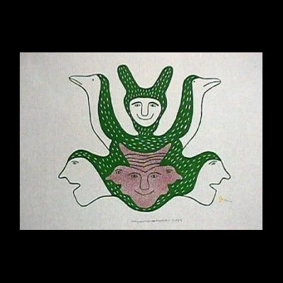 Born: February 28, 1941 Female E2-423 Place of Birth: Princess Mary Lake (Kazan River area) Resides: Baker Lake Drawings, Prints, Printmaking, Wallhangings, Sculpture Irene’s husband, David Tiktaalaaq, is a carver and printmaker. Her brother, William Ukpatiku, is also a carver and printmaker, as well as a crafts artist. “Avaalaaqiaq’s style is bold and colorful, much like the artist herself. Her subject matter tends always to be shamanic in origin and is based on the Inuit myths, legends, and beliefs of traditional times as told to her by her grandmother. The shamanic belief system practiced in traditional times called for an easy interplay between man and animals. Avaalaaqiaq’s hybrid, flowing figures aptly portray this harmonious relationship–the forms are fluid and flat–half human, half animal; their heads are often in profile or duplicate halves, with staring eyes and gaping mouths. Her unique figures are readily recognizable. Avaalaaqiaq often sews a border around her imagery, perhaps to contain its unworldly content.”