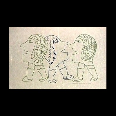 Born: February 28, 1941 Female E2-423 Place of Birth: Princess Mary Lake (Kazan River area) Resides: Baker Lake Drawings, Prints, Printmaking, Wallhangings, Sculpture Irene’s husband, David Tiktaalaaq, is a carver and printmaker. Her brother, William Ukpatiku, is also a carver and printmaker, as well as a crafts artist. “Avaalaaqiaq’s style is bold and colorful, much like the artist herself. Her subject matter tends always to be shamanic in origin and is based on the Inuit myths, legends, and beliefs of traditional times as told to her by her grandmother. The shamanic belief system practiced in traditional times called for an easy interplay between man and animals. Avaalaaqiaq’s hybrid, flowing figures aptly portray this harmonious relationship–the forms are fluid and flat–half human, half animal; their heads are often in profile or duplicate halves, with staring eyes and gaping mouths. Her unique figures are readily recognizable. Avaalaaqiaq often sews a border around her imagery, perhaps to contain its unworldly content.”